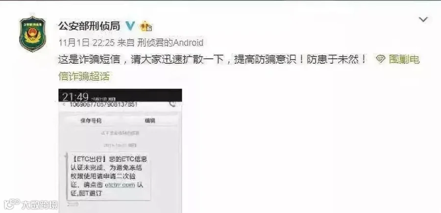 公安部刑侦局官方微博@公安部刑侦局,发布过防骗提醒,车主如果遇到这样的短信,千万要留心。