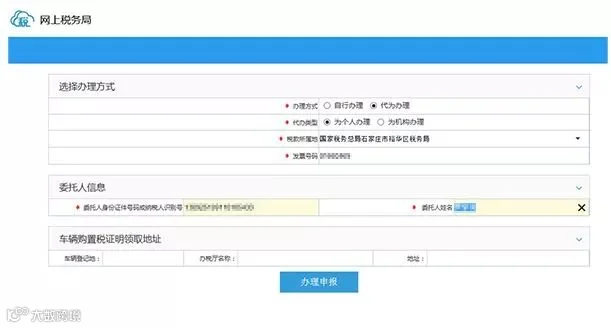 2.代办类型:“为个人办理”是4s店(或卖车企业)为自然人办理车购税申报缴税;“为机构办理”是4s店(或卖车企业)为企业(单位)办理车购税申报缴税。