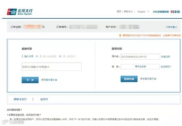 2.银联支付界面,按照提示进行支付。