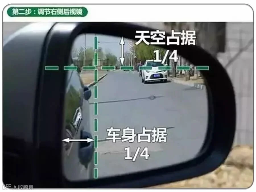 右侧后视镜调整:右侧的调整与左侧调整会不同,车身同样是占据镜子的竖直方向的四分之一处,而天空则占据镜子横向的四分之一;
