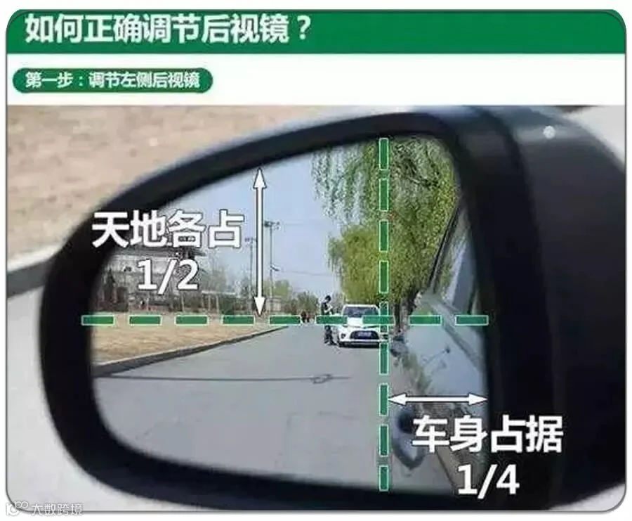 左侧后视镜调整:侧身占据镜子竖直方向的四分之一处,而天和地各占镜子横向的二分之一;
