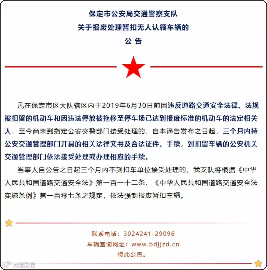 导读:保定市公安局交通警察支队关于报废处理暂扣无人认领车辆的公告