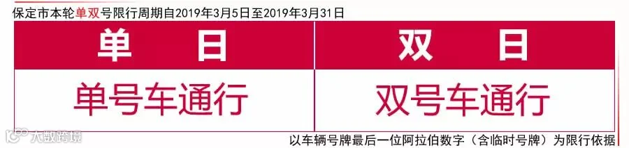 截至发稿前,我市的安国、博野、定兴、阜平、高阳、涞水、蠡县、满城、清苑、曲阳、顺平、唐县、望都、徐水14个县(市、区)已发布实行机动车单双号限行公告,2019年3月5日至2019年3月31日与保定市主城区同步实行单双号限行措施,限行具体时段为周一至周五每日7时至20时,每周六日全天不限行。