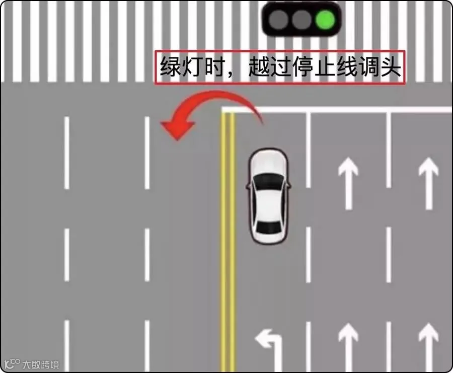 2、停止线左侧是虚线,不用考虑红绿灯,直接在虚线部分调头。