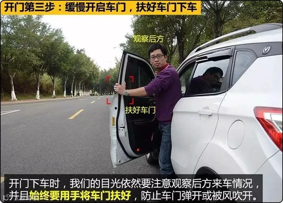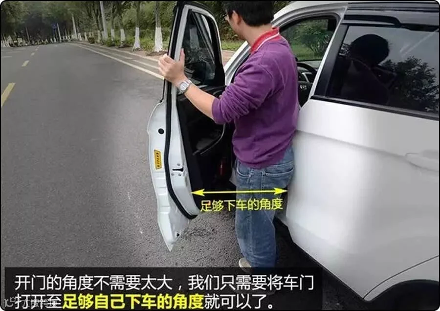 我们从门缝中确认后方安全后,就可以下车了。下车时,我们的目光依然要注意观察后方来车情况,并且始终要用手将车门控制在可控范围内。我们只需要将车门打开至足够下车的角度就可以了,千万不要一把推开车门。