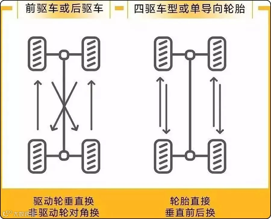 把握一个前提:“四同”原则,即换胎时保证四条轮胎为同一厂型轮胎、尺寸、花纹、规格。如果车辆因爆胎等其他因素将个别轮胎更换了厂型或花纹,或使用了尺寸稍有变化的备胎,这时就不能直接进行轮胎换位,只有厂型、尺寸、花纹、规格四者相同的情况下方可进行轮胎换位,否则会造成跑偏等现象。(注:轮胎换位时,尽量不要把因漏气补过的轮胎用做备胎,或安装于非驱动轮使用,保证把状况最好的轮胎装于驱动轮,避免爆胎导致方向失控。)