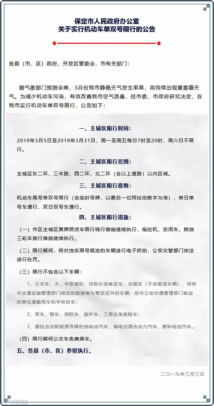 导读:自2019年3月5日起,保定市限行又有变化了限行公告如下