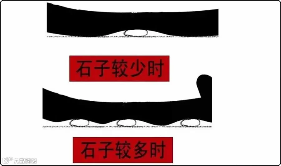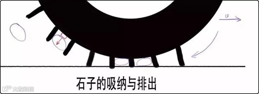 这样的设计导致普通轮胎在滚过有石子的路面时,较大的石块无法被狭窄的花纹沟吸纳,如下图。