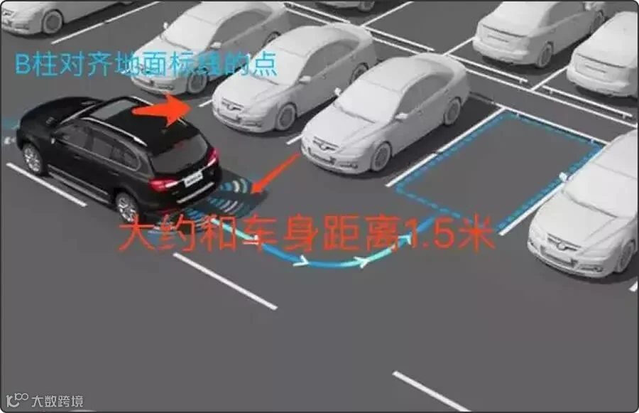 2、当车子的右后视镜对准前方车辆的B柱时,方向盘应该往右边打死(左边即对左)。