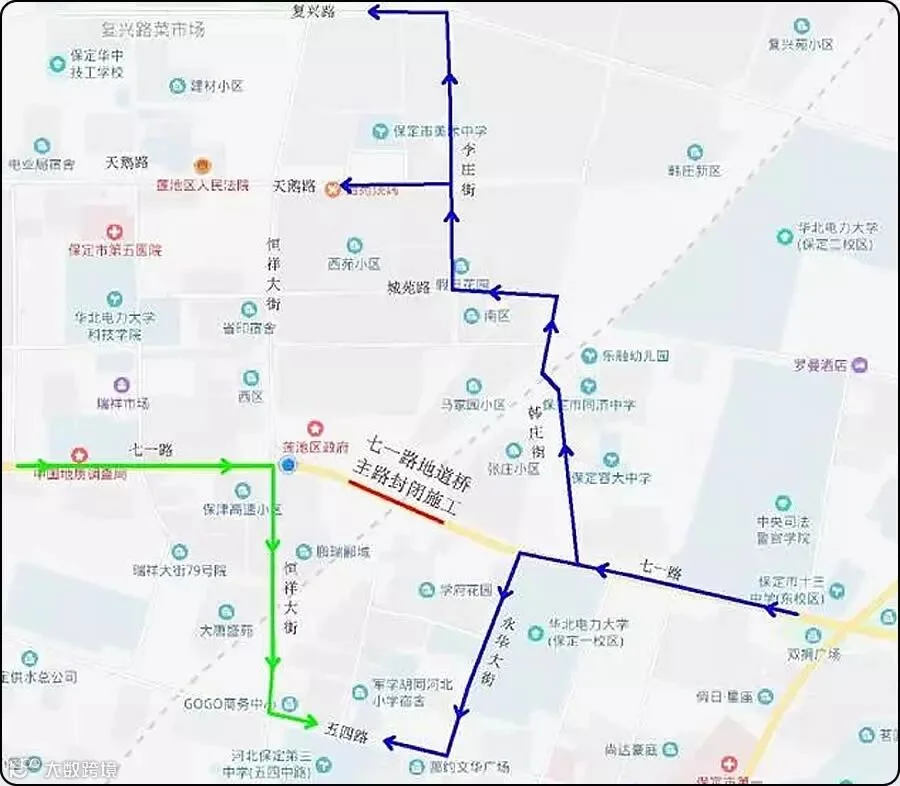 由于七一路地道桥道路施工,造成东西双向严重压车,为防止发生拥堵,请提前选择合适绕行道路通行。