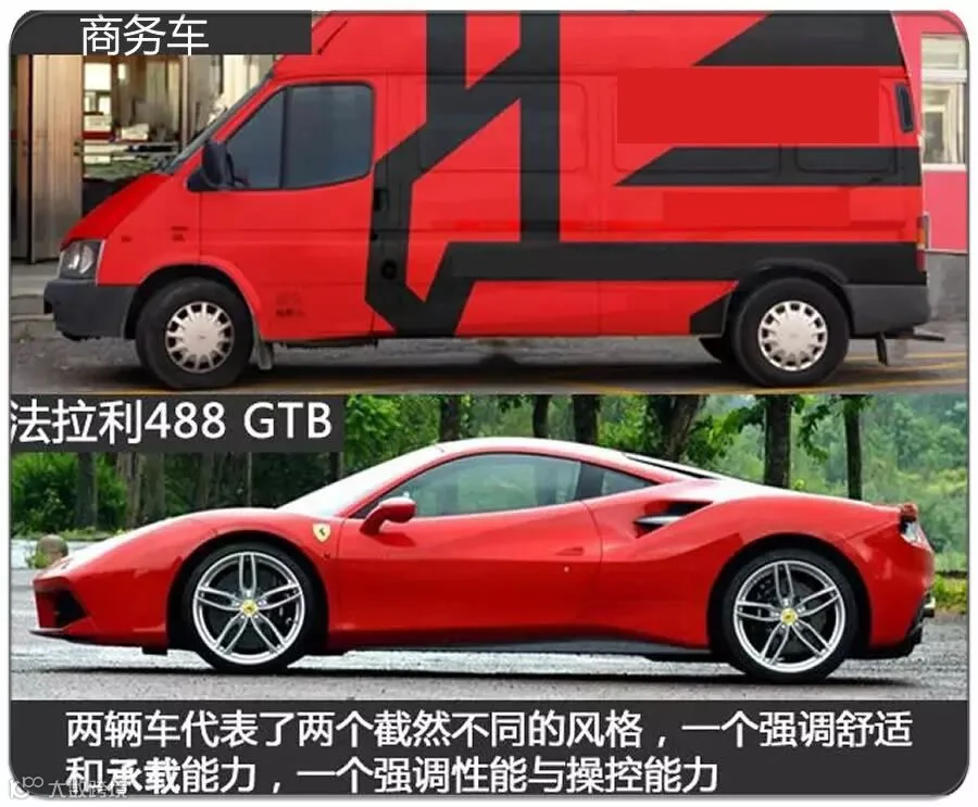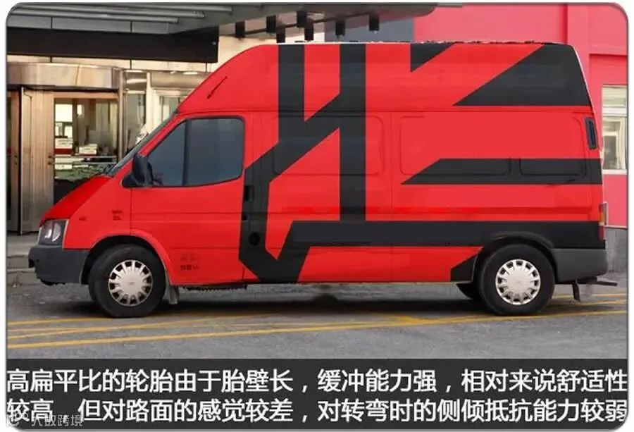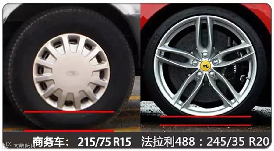 由图片可以看出,不论是轮胎的数据还是外观看来,上图商务车的轮胎的扁平比是法拉利轮胎的扁平比两倍还多,这样你就会了解到轮胎的扁平比对于汽车的驾驶有很大的意义!