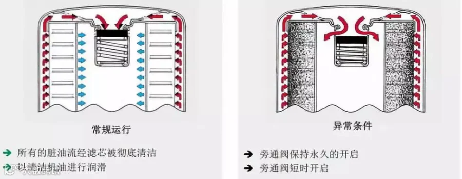 当机油格内因机油粘度过高或被杂质堵塞时旁通阀打开,机油不经滤清器过滤直接进入主油道运行,维持发动机的最基本运行。