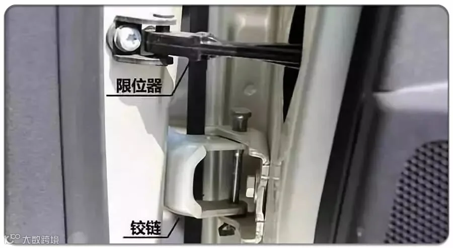 车门和车身通过铰链和限位器连接在一起,前者是固定作用,后者限制车门的打开角度。