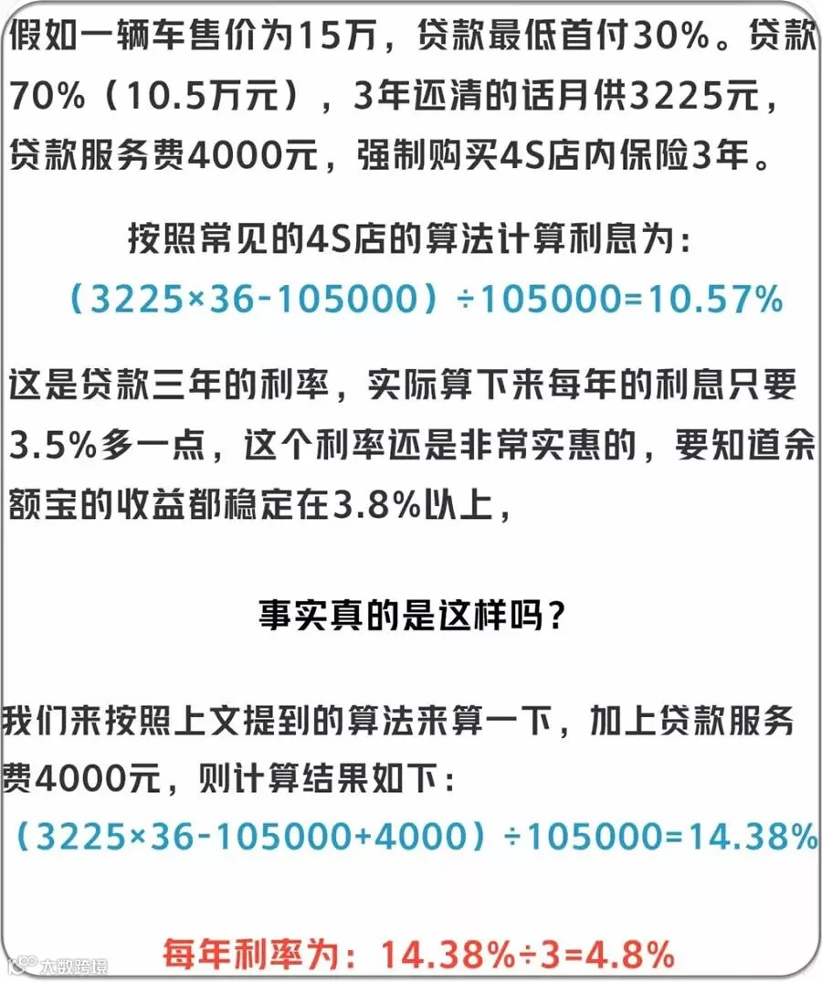怎么样,有没有发现实际的贷款利率可能比宣传的利率高出不少,虽然4.8%的贷款利率也是比较合理的水平,但需要注意,由于贷款,4S店捆绑销售保险会产生相对其他渠道更昂贵的保险费用,虽然加上保险的额外费用后整体利率依然处于合理范围,但我们还是要自己算清楚这笔账,明明白白消费才好。