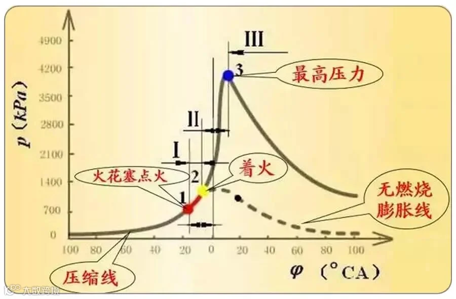 现代汽车发动机的压缩比一般为8~11,火花塞工作时,受到的压力是从大约1个大气压到活塞上止点的8~11个大气压,再到做功冲程的30-40个大气压,周而复始,火花塞受到的压力,大致是在大约1-40个大气压之间循环。如下图所示。