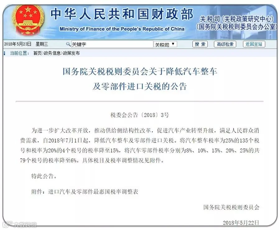 5月22日财政部发布公告,自2018年7月1日起,将税率分别为25%、20%的汽车整车关税降至15%,降税幅度分别为40%、25%;将税率分别为8%、10%、15%、20%、25%的汽车零部件关税降至6%,平均降税幅度46%。