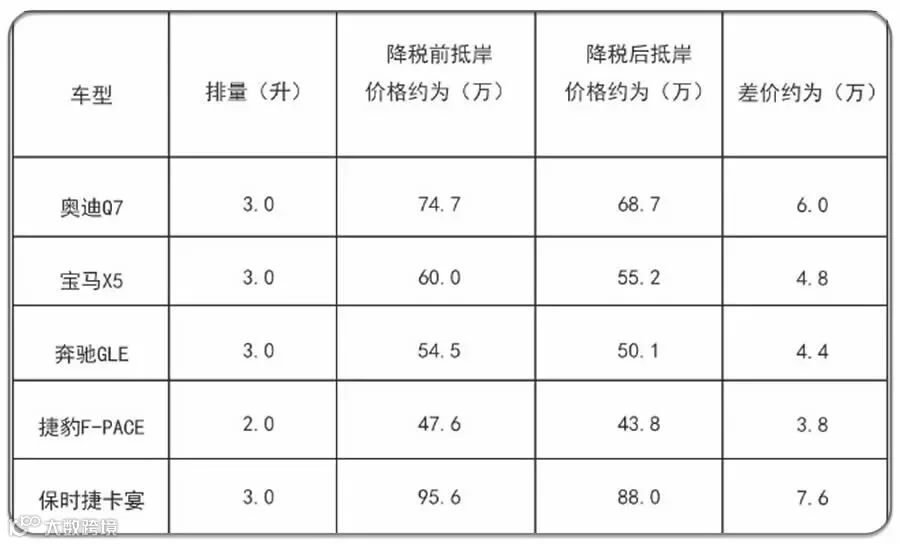 所以一款车的抵岸价(交过税的价格)会比原车价有较大幅度的提升。而关税下调10%,将会让进口车的成本降低不少,具体会降多少呢?请看下表。