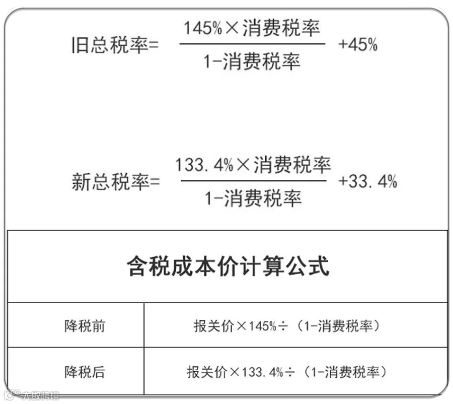 进口总税率会下降多少呢?我们先看看关税下降前后,总税率的计算公式:
