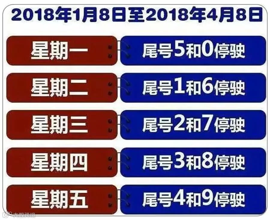 2018年1月8日至2018年4月8日,工作日周一至周五分别限行5和0,1和6,2和7,3和8,4和9,以车辆号牌最后一位阿拉伯数字为限行依据。
