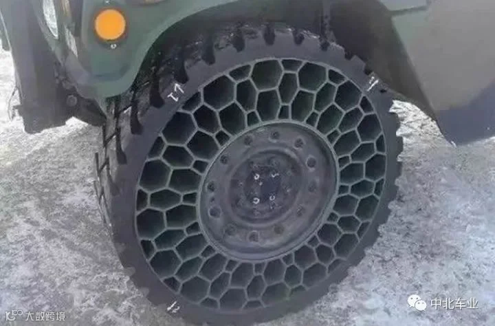 这款轮胎美国威斯康辛州麦迪逊的聚合物研究中心推出,主要是军用。从侧面看,这款胎由实心的胎面和蜂窝状的支撑结构。这种轮胎的好处非常明显,蜂窝状的支撑结构能够在保证减震效果的同时提供更高的强度;实心的胎面免去了爆胎的后顾之忧,在弹片横飞的战场上能够降低士兵暴露在车外的概率。