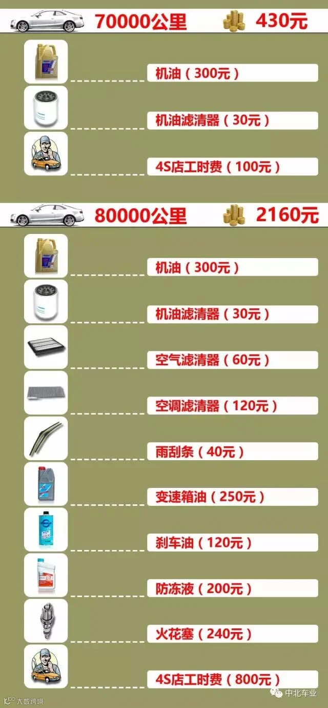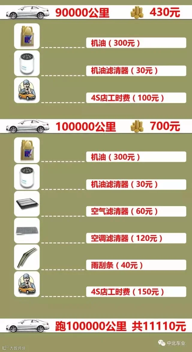 一辆10万左右的家轿,一般跑10万公里,到底要花费多少银子在保养上呢?话不多说,直接上图。