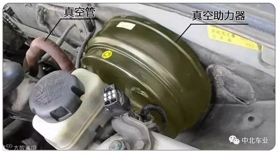 在发动机舱内的这个“大包”就是真空助力器,它的一根管连接到发动机的进气歧管来获取真空。而那些发动机本身无法提供负压真空的(比如柴油发动机、增压发动机)则会选用的凸轮轴驱动的机械真空泵或电动真空泵来代替。