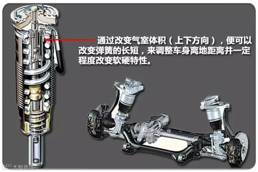 空气悬挂,顾名思义,也是悬挂的一种形式,它不同于我们平时常常见到的螺旋弹簧加减震筒组成的悬挂,空气悬挂系统内部装有压缩空气的空气弹簧和阻尼可变的减震器,它利用气体的可压缩性来实现其弹性作用。在悬挂内部,气压可以随着载荷还有道路条件的变化而进行自动调节。