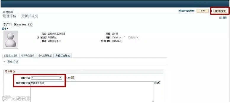 年末,在员工完成绩效测评之后,经理级别人员主要承担员工年度综合评估工作。对员工们的关键绩效指标、价值观以及年度综合评估进行评价和指导。记得在填写完成后点击“提交以审批”,确保提交成功哦。