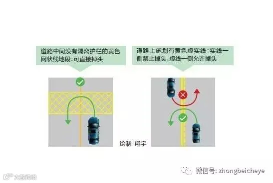 这个时候是不能直接掉头的,需要绕过斑马线进行掉头。如果是虚线,那么可以掉头,如下图所示