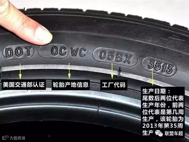 如何看轮胎的生产日期了?轮胎上一般都会有4位数字标注的生产日期,后面两位是年份,前面两位是第几周,比如,下图的轮胎就是13年第35周生产。