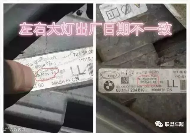 汽车大灯都有出厂日期标签,但是在安装过程中,会被撕掉或者装起来无法查看到。正常情况下,前大灯的生产日期比较容易看,打开引擎盖之后,大灯总成的上方都能看到生产的日期。如果发现两个大灯的生产日期和车辆出厂日期差距大(比如1年以上),或者两个大灯之间的日期差距也很大,这时候就小心了,说明大灯一定换过,通常肯定在大灯处发生过刮蹭或者事故,如果还要购买就要进一步检测大灯附近的损伤情况。