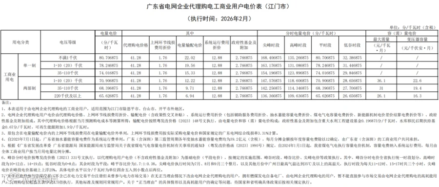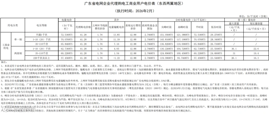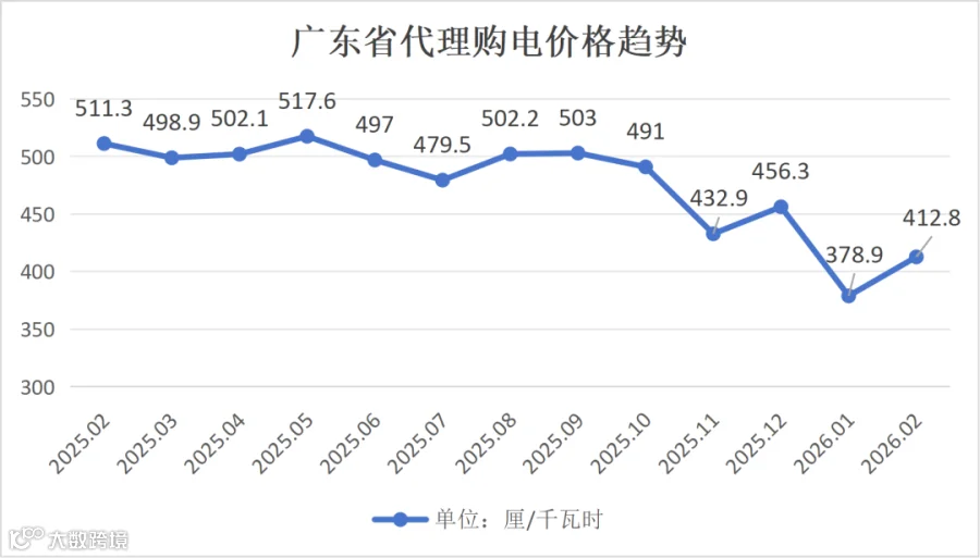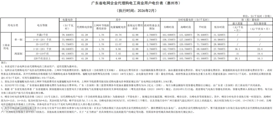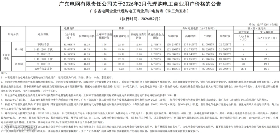 最近,广东电网有限责任公司公布2026 年2月代理购电工商业用户电价——0.4128元 / 千瓦时,比今年1月(0.3789元/千瓦时)环比上涨 8.95%,还比去年2月(0.5113元/千瓦时)同比下降 19.26%。