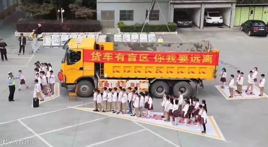 图中站了49个小朋友,坐在货车驾驶室的驾驶人竟然一个都看不到!!!而且,这只是一辆静止不动的大货车,如果它在复杂的道路环境下行驶,危险往往更不可知!