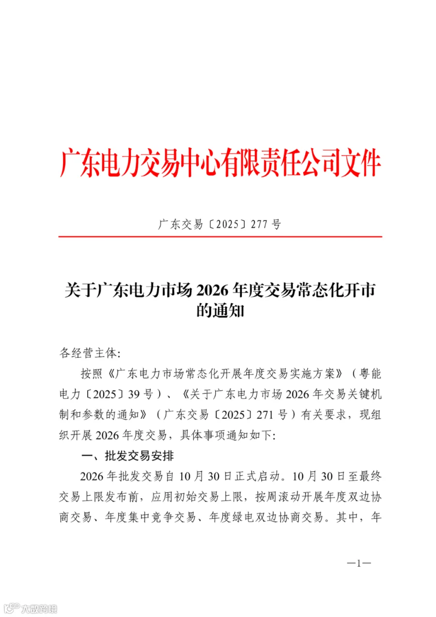 根据10月22日广东电力交易中心发布的最新文件,2026年度电力交易常态化开市安排正式明确 —— 批发交易10月30日启动,零售合同签约10月24日开启!