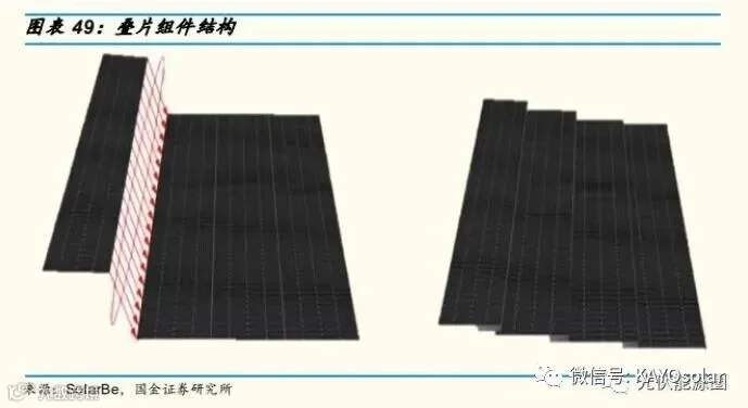 叠片电池组件技术将电池片切割为 4-5 份小片,再将电池正反表面的边缘区域制备成主栅,然后使前一片电池的前表面边缘与下一片电池的背表面边缘互联。这样的设计使得电池片以更加紧密的方式互相连接,电池间缝隙降到最低,边缘甚至稍微重叠。叠片组件技术采用整体无主栅设计,通过一种类似导电胶的方式将电池以串并联结构紧密排布,省去了焊带焊接。