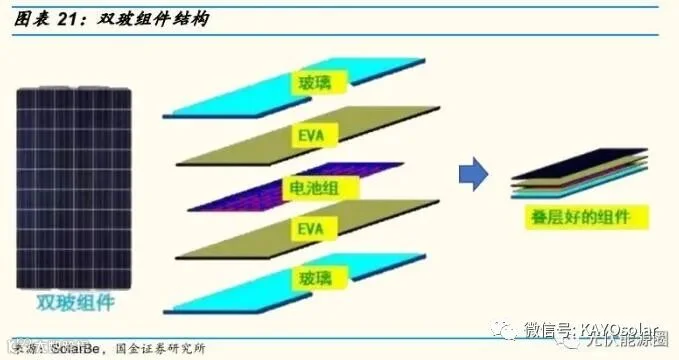 双玻组件由两块钢化玻璃、EVA胶膜和太阳能电池片经过层压机高温层压组成复合层。它包括由上至下依次设置的钢化玻璃层、材料层(PVB、PO、EVA 或离子聚合物)、单晶或多晶电池组层、材料层、钢化玻璃层。