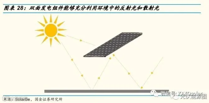 发电增益受反射背景、组件朝向、安装角度、离地高度的影响:双面发电组件安装角度可从 0°到 90°,角度越大较常规组件发电量增益越多;配合跟踪轴等追踪设备后发电量增加显著;背景颜色越浅,背景反射率越高,发电量提升越多;离地高度越高,组件与地面之间的空间越大,则组件背面可接收的周围反射面越大,发电量越多。