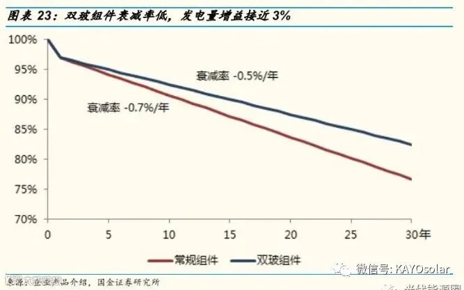 增益:低衰减率贡献发电量增幅 3%。由于双玻组件的衰减率比单玻组件降低约 0.2 个百分点,相同发电条件下,双玻组件的发电量较之传统组件会提高 3%。