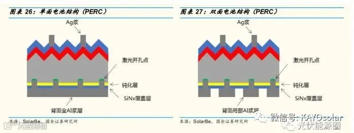 电池背面效率略低于正面,背面透光导致正面效率略降:由于激光开孔点仍然需要栅格来疏导光生电流,故电池背面大部分区域仍覆盖了Al/Ag 浆,且铝栅格导电性不如银栅格,故铝栅线较宽,背面覆盖率高达 30%~40% , 因 此 背 面 可 吸 收 光 线 的 区 域 有 限 , 转 化 效 率(10%~15%)明显低于正面(20%以上)。同时,由于背面由全 Al 层改为局部覆盖,透光量增加,电池正面效率可能会下降 0.2-0.5%。