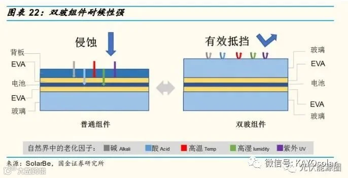 各项性能均改善,适用范围显著扩大。由于双玻组件采用双玻璃压制而成,其耐候性、发电效率都优于传统组件,尤其是对于分布在湿度较高、酸雨或盐雾较大地区的光伏电站、农业大棚光伏电站、大风沙地区光伏电站,双玻组件优势更加显著: