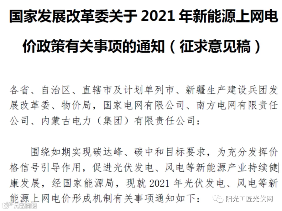 国家发改委就2021年新能源上网电价政策征求了相关部门意见,根据征求意见稿