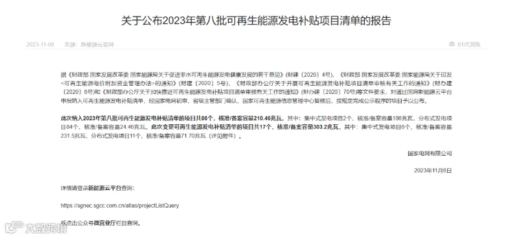 11月8日,新能源云平台发布2023年第八批可再生能源发电补贴项目清单。