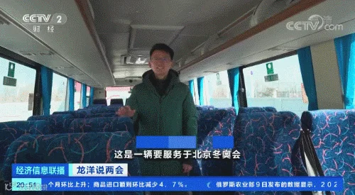 记者 张景:这是一辆要服务于北京冬奥会延庆赛区的客车,内饰跟一般的客车啥区别。但是它的顶上有几个储存氢气的罐子。氢气跟大气中的氧气化学反应,就能发电,驱动车辆行驶。排出的没有尾气,而是可以直接饮用的水。