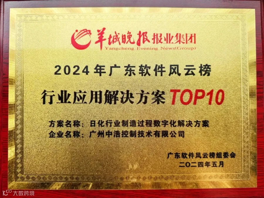 羊城晚报报业集团联合广东软件行业协会、广东省大数据协会,开展2024年广东软件风云榜征集活动。中浩控制申报的“日化行业制造过程数字化解决方案”经过专家评审,荣获2024年广东软件风云榜优秀行业应用解决方案TOP10。