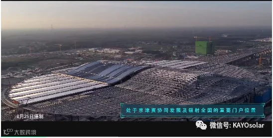 雄安站站房6MW屋顶分布式光伏发电项目,“自发自用、余电上网”模式,每年可为雄安高铁站提供580万度清洁电力,超过整个车站电力使用的20%,每年可节约标煤约1800吨,减少二氧化碳排放4500吨,真正实现亚洲最大的绿色铁路站。