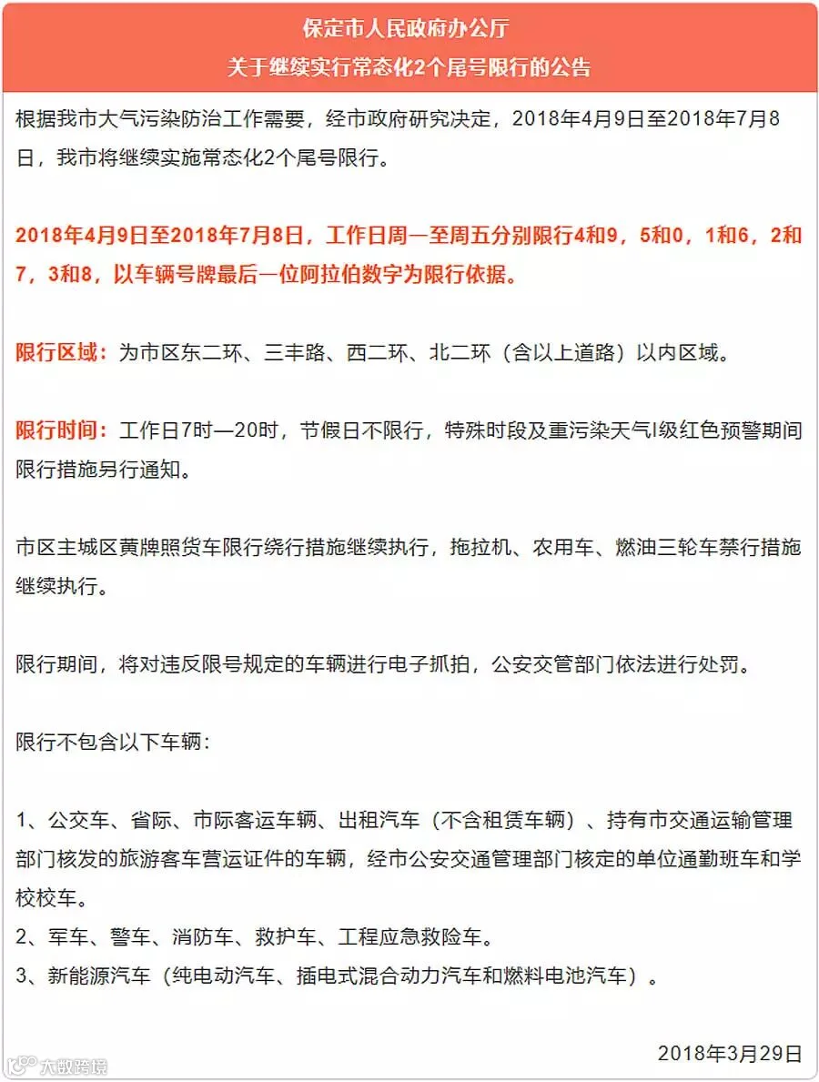 权威发布 | 保定市人民政府办公厅 关于继续实行常态化2个尾号限行的公告