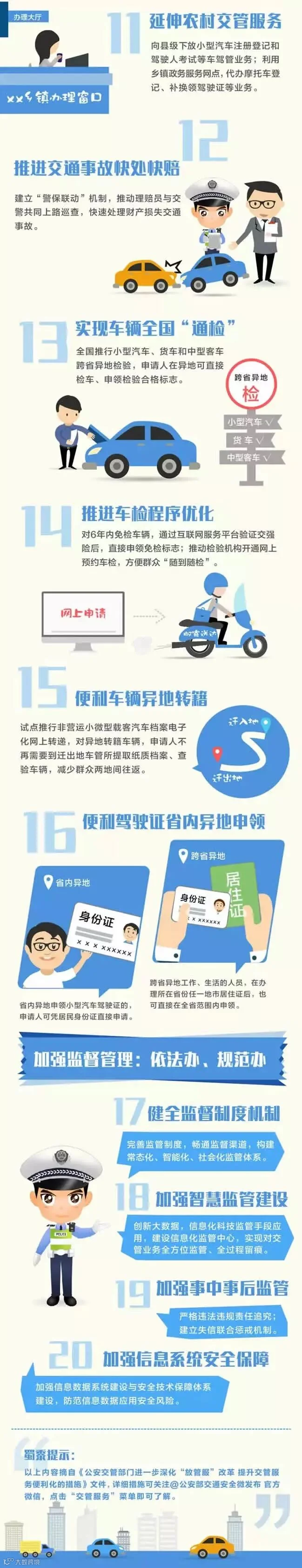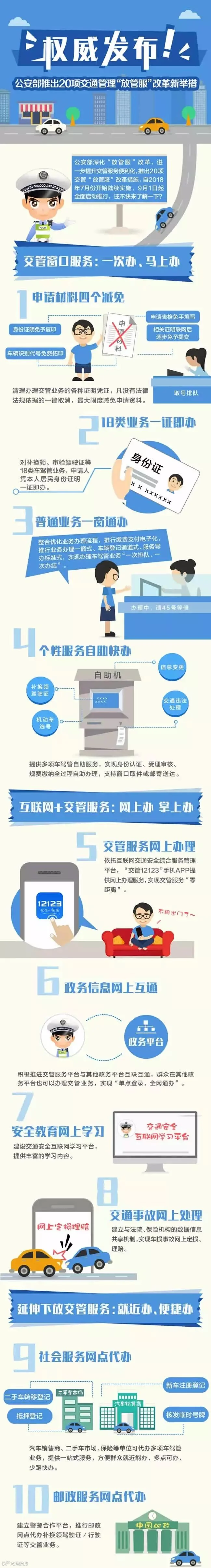 9月1日起,公安部20项交通管理“放管服”改革新措施全面启动推行:①补换领驾驶证等18类业务,凭身份证明一证即办;②驾考预约、机动车选号等网上办理;③车辆全国“通检”,小型汽车等可在登记地以外省份直接检验……