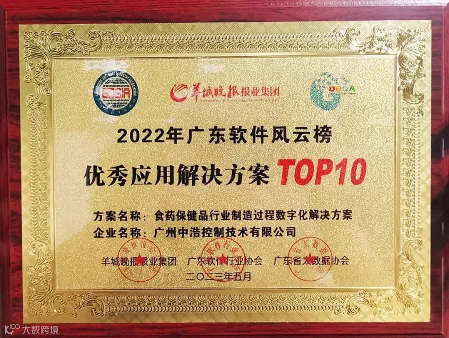羊城晚报报业集团联合广东软件行业协会、广东省大数据协会,开展2022广东软件风云榜征集活动。中浩控制申报的“食药保健品行业制造过程数字化解决方案”经过专家评审,荣获2022年广东软件风云榜优秀应用解决方案top10。