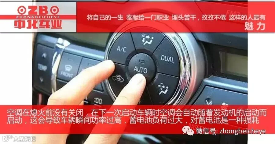 很多人车辆熄火前都不习惯去关空调;在下一次启动时,空调会随着汽车的启动而同时开启。这种习惯会对蓄电池产生损害,因为如果空调在熄火前没有关闭,在下一次启动车辆时空调会自动随着发动机的启动而启动,这会导致车辆瞬间功率过高,蓄电池负荷过大,长久反复多次对蓄电池是一种损耗。