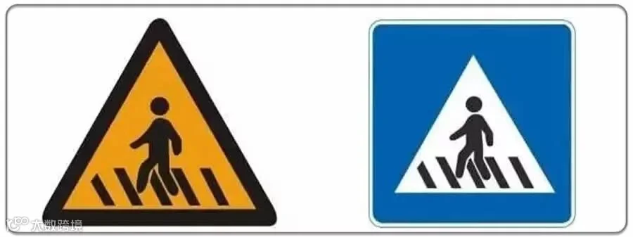同样是符号相同,但颜色和形状都不同的两个标识,黄色依旧表示注意,蓝色则表示告知规则。